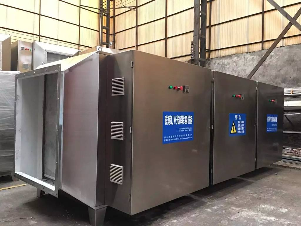 UV光解氧化廢氣凈化裝置采用高強度納米紫外線破壞、分解大分子鏈為小分子鏈,再利用臭氧和烴基自由基、催化劑進行催化氧化,使有機物變為二氧化碳和水。