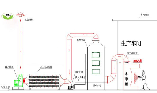 有機廢氣 → 風(fēng) 機→ 風(fēng) 管→ 旋流板塔→風(fēng)機→ 活性炭吸附塔→ 達標排放